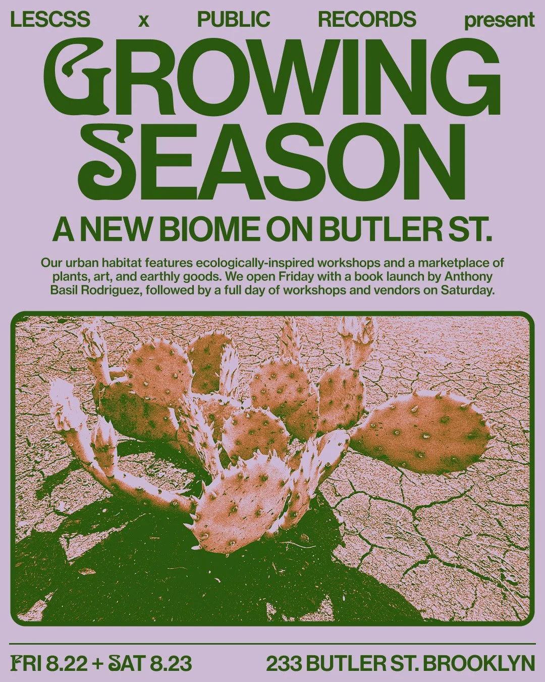 Growing Season: A New Biome on Butler St Saturday, August 23, 2025 11:00 AM 5:00 PM Public Records 233 Butler St Brooklyn, NY, 11217 United States (map) Google Calendar ICS Join us at Public Records Saturday, August 23 for GROWING SEASON - an urban habitat that features ecologically-inspired workshops and a marketplace of plants, art, and earthly goods. We will be there with herbs, apothecary items, merch and MORE! FREE RSVP